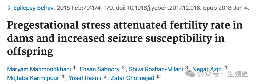 Pregestational stress attenuated fertility rate in dams and increased seizure susceptibility in offspring. Epilepsy Behav. 2018 Feb;79:174-179. doi: 10.1016/j.yebeh.2017.12.016. Epub 2018 Jan 4.