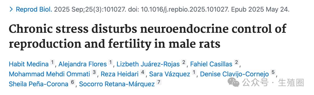 Chronic stress disturbs neuroendocrine control of reproduction and fertility in male rats. Reprod Biol. 2025 Sep;25(3):101027. doi: 10.1016/j.repbio.2025.101027. Epub 2025 May 24.