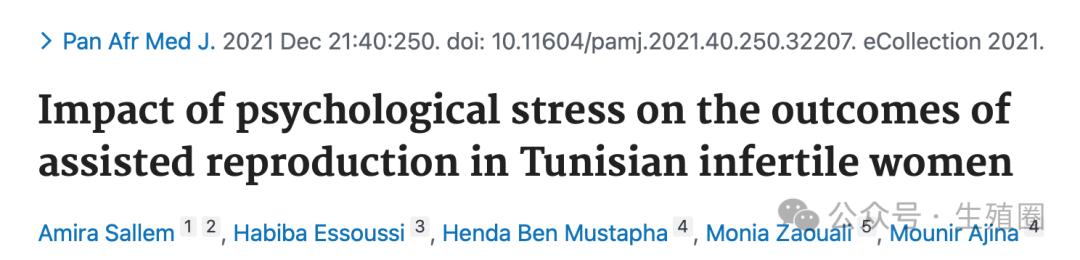 Impact of psychological stress on the outcomes of assisted reproduction in Tunisian infertile women. Pan Afr Med J. 2021 Dec 21;40:250. doi: 10.11604/pamj.2021.40.250.32207.