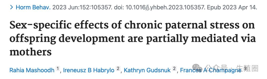 Sex-specific effects of chronic paternal stress on offspring development are partially mediated via mothers. Horm Behav. 2023 Jun;152:105357. doi: 10.1016/j.yhbeh.2023.105357. Epub 2023 Apr 14.