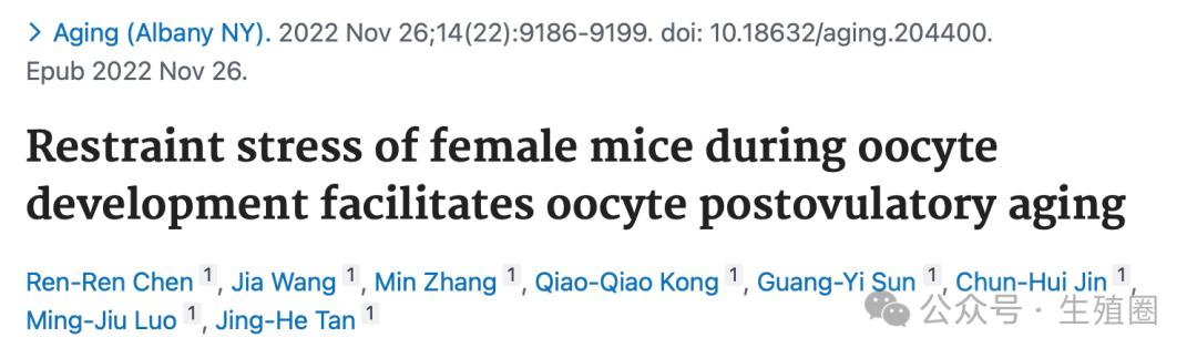 Restraint stress of female mice during oocyte development facilitates oocyte postovulatory aging. Aging (Albany NY). 2022 Nov 26;14(22):9186-9199. doi: 10.18632/aging.204400. Epub 2022 Nov 26.