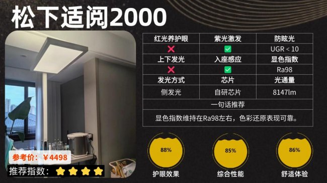 护眼大路灯第二名:松下适阅2000;显色指数维持在Ra98左右,色彩还原表现可靠。