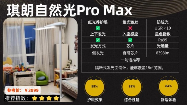 护眼大路灯第四名:琪朗自然光Pro Max;加入AI智能调光模式,支持智能感光。