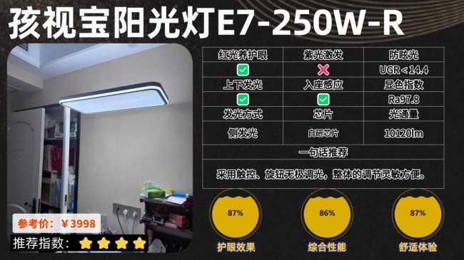 大路灯哪个牌子好用又便宜?孩视宝 E7-250W-R 在光学结构上采用上、中、下三向出光设计,用来提升整体照明的覆盖范围和均匀度。顶部加入四重透镜光学系统,侧面配合环形补光结构,通过多维漫射让光线更加柔和,从而让室内光环境看起来更平衡。功能方面增加了节律照明模式,可以模拟自然光在一天中的变化节奏,不过作为系列中的顶配型号,它的售价也比较高,整体性价比相对一般,更适合对配置要求比较高的人群。