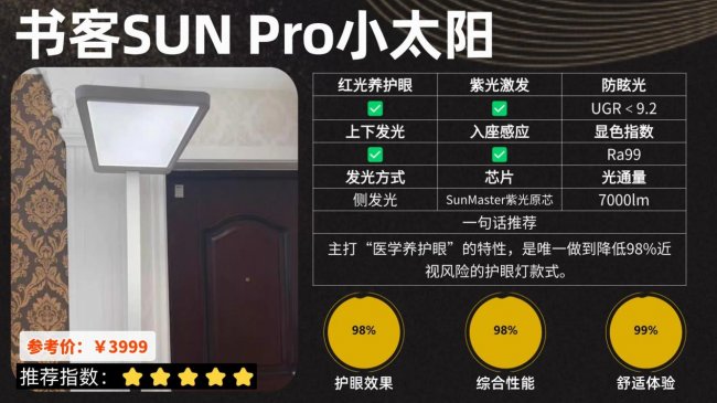 护眼大路灯第五名:书客护眼大路灯SUN Pro小太阳;出口欧美多年的专业老牌子,有效降低98%近视风险!