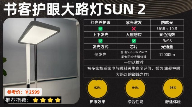 护眼大路灯第一名深度解析:书客护眼大路灯SUN2;在各大中高端口碑、销量排行榜中常年霸榜第一,有效降低98%近视风险。
