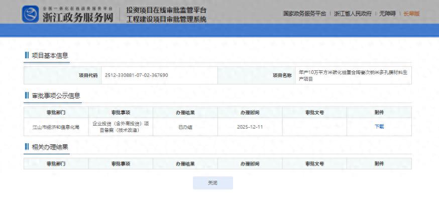 02、总投资1.1亿元,浙江公司拟扩建碳化硅复合陶瓷膜生产线12月11日,浙江省投资项目在线审批监管平台正式发布备案公示,浙江坚膜科技有限公司“年产10万平方米碳化硅复合陶瓷次纳米多孔膜材料生产项目”完成备案,标志着这家国家级高新技术企业在高端碳化硅膜产业化布局上迈出重要一步。该项目总投资1.1亿元,选址衢州市江山市莲华山工业园,建成后将进一步巩固浙江在国内碳化硅陶瓷膜产业的优势地位。