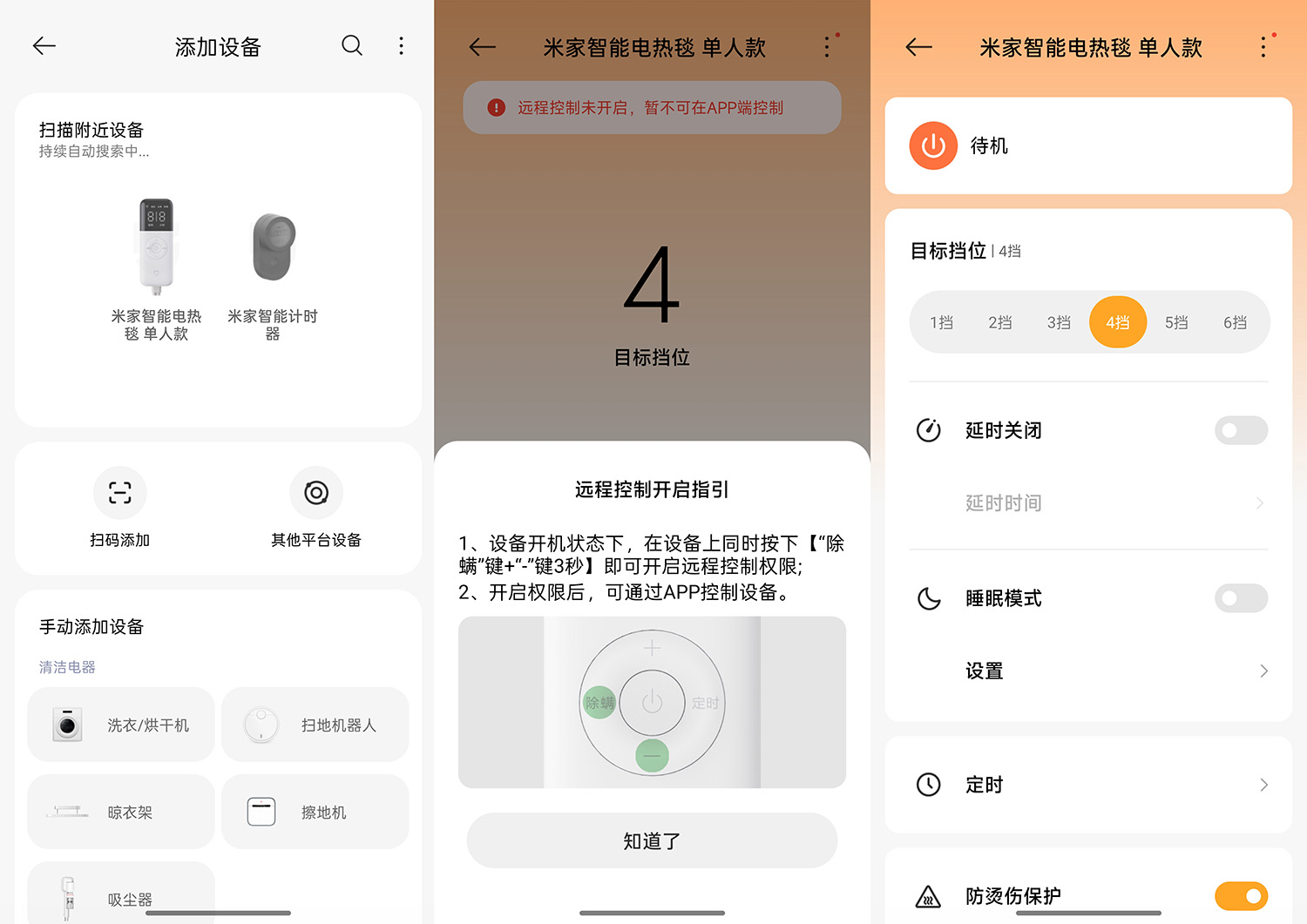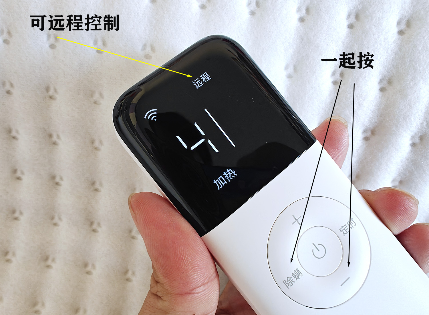 默认米家智能电热毯是脱机工作的,想要实现联网米家APP,需要同时按下除螨和档位-按键才开启远程模式,这样就可以接入米家APP实现更多智能化的功能了。