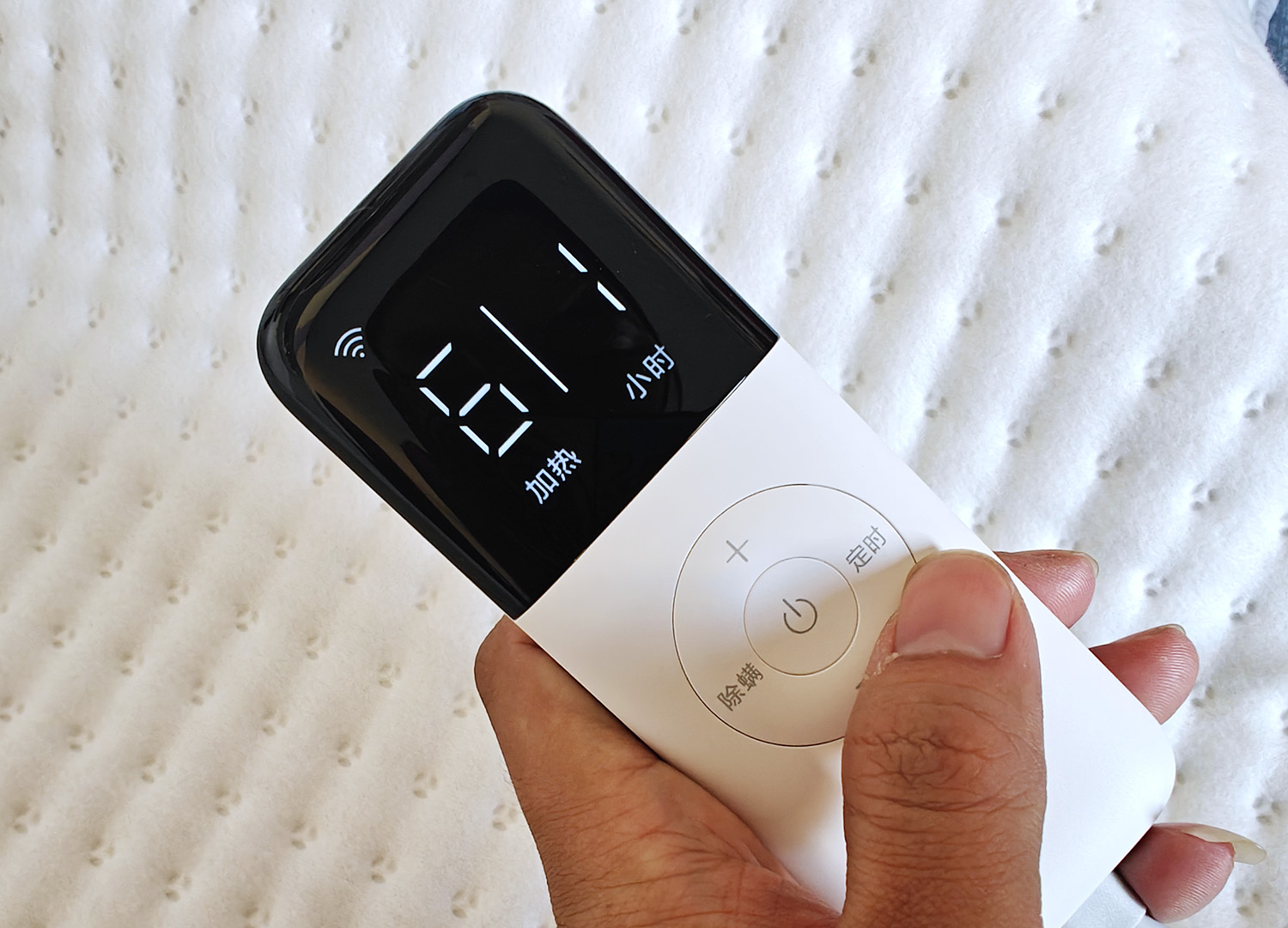 米家智能电热毯自带有一个遥控器,黑白设计很漂亮。顶部显示区有两个数字,左边是加热档位,右边是定时的时间。下面圆形按键中间是开关,上下是调节档位,左边是除螨,右边是定时。