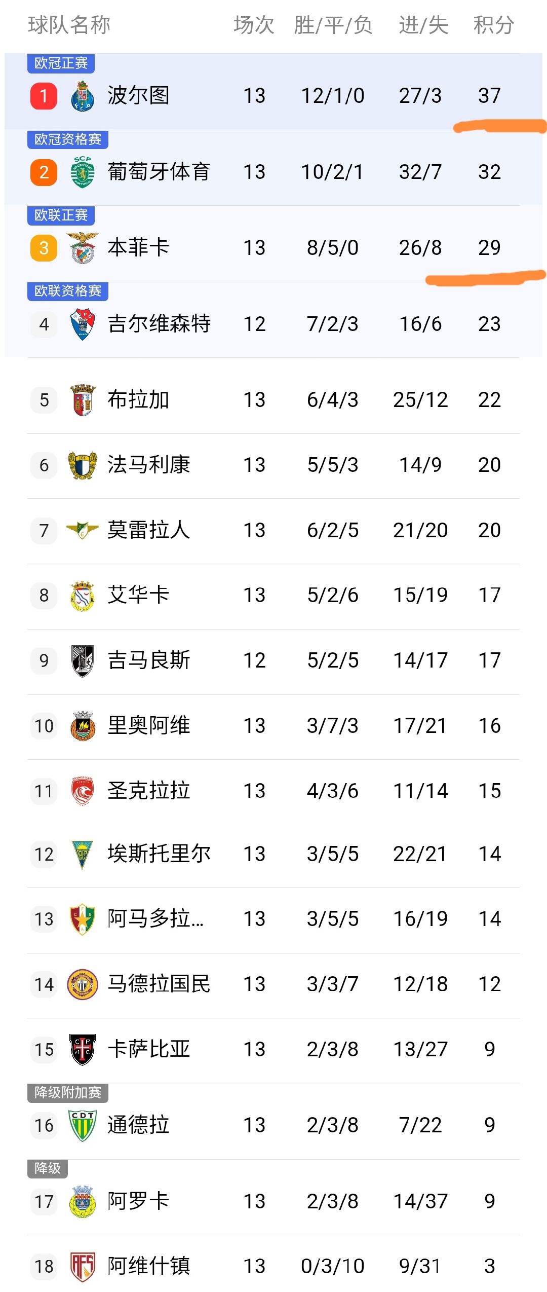 今天凌晨,葡超第13轮结束了一场重头戏,穆帅争冠劲敌波尔图出战,在这场比赛结束之后,葡超积分榜得到进一步的更新,穆帅执教的本菲卡队距离榜首分差被进一步拉大,我们来看看。