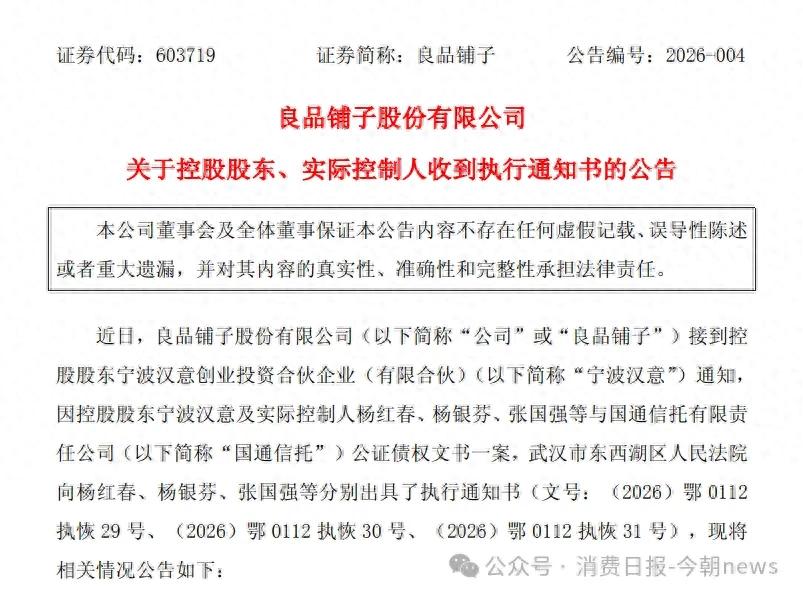 2月3日晚间,“高端零食第一股”良品铺子发布公告称,公司接到控股股东宁波汉意的通知,因宁波汉意及实际控制人杨红春、杨银芬、张国强等与国通信托公证债权文书一案,杨红春、杨银芬、张国强等人收到执行通知书,合计包含债务本金2.8亿元及执行费约48.28万元。