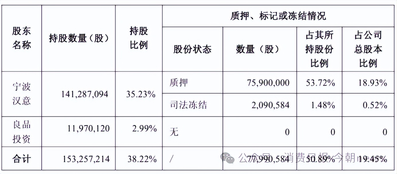 最新公告显示,宁波汉意及其一致行动人合计持有良品铺子1.53亿股、持股比例38.22%,其中,宁波汉意超一半的股权(7799.06万股)处于质押或司法冻结状态,占公司总股本的19.45%。