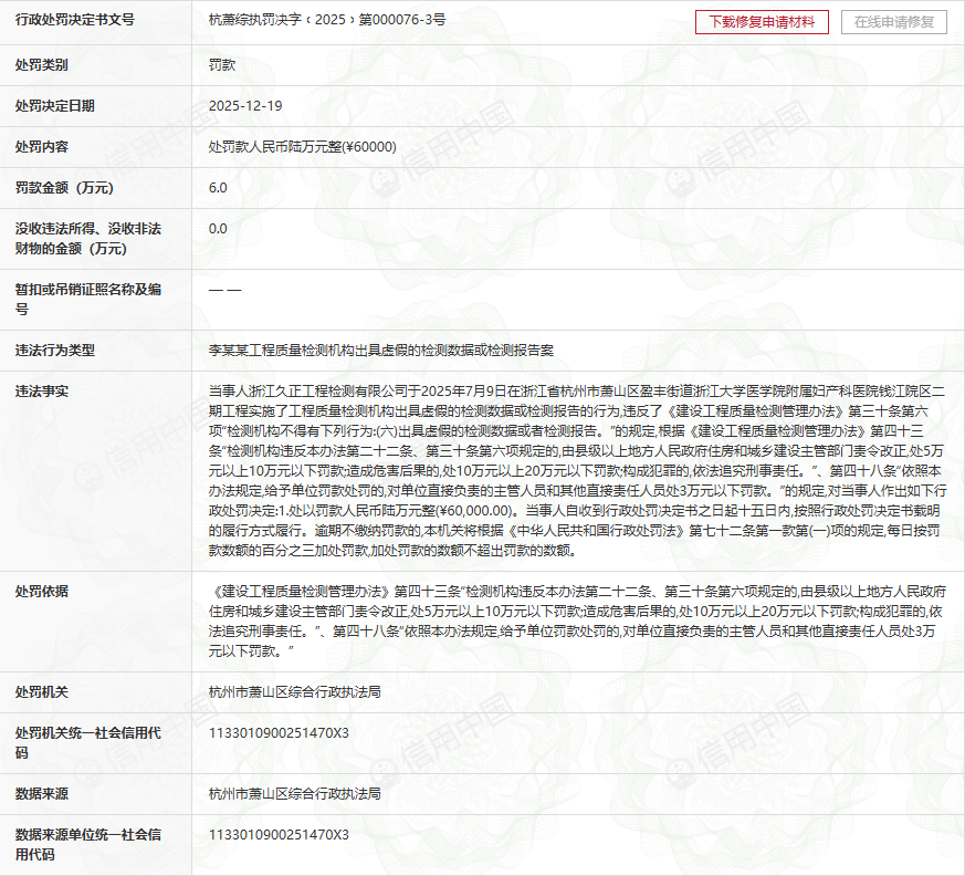 2025年12月19日,杭州市萧山区综合行政执法局作出杭萧综执罚字〔2025〕第000076-3号行政处罚决定,浙江久正工程检测有限公司因在医院工程项目检测中出具虚假检测数据和报告,被处以6万元罚款。此次处罚直指工程检测行业的诚信底线问题,彰显了监管部门对工程质量检测造假行为的“零容忍”态度。