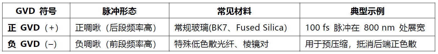 大多数光学元件在可见‑近红外区呈正色散,即长波长比短波长更快。结果是脉冲的后半部分(高频)相对前半部分(低频)出现延迟,形成正啁啾。