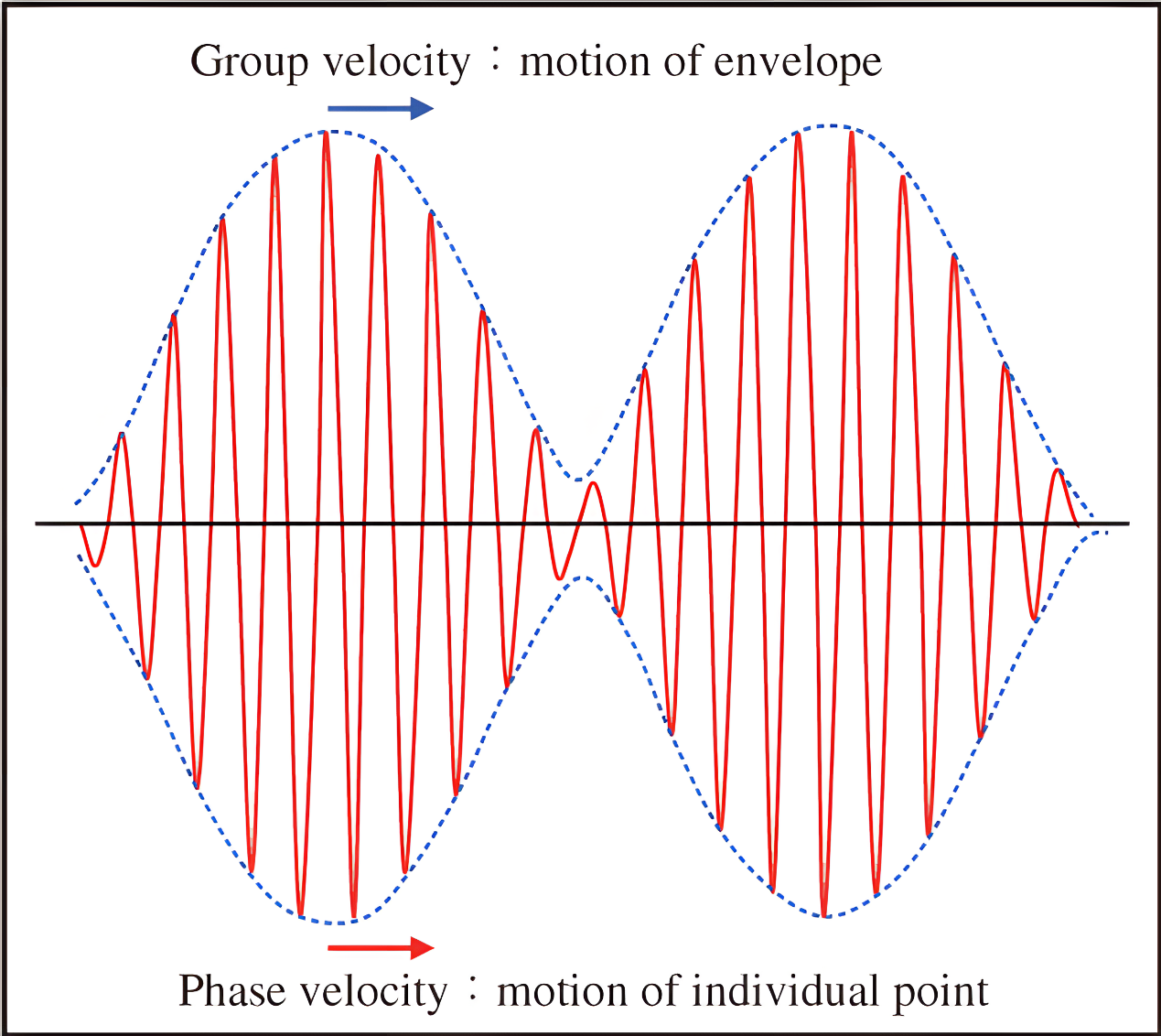 图2:群速度决定包络(波束)的运动(以虚线图示),相速度决定波本身各个位置的更高频率的运动(以实线图示)