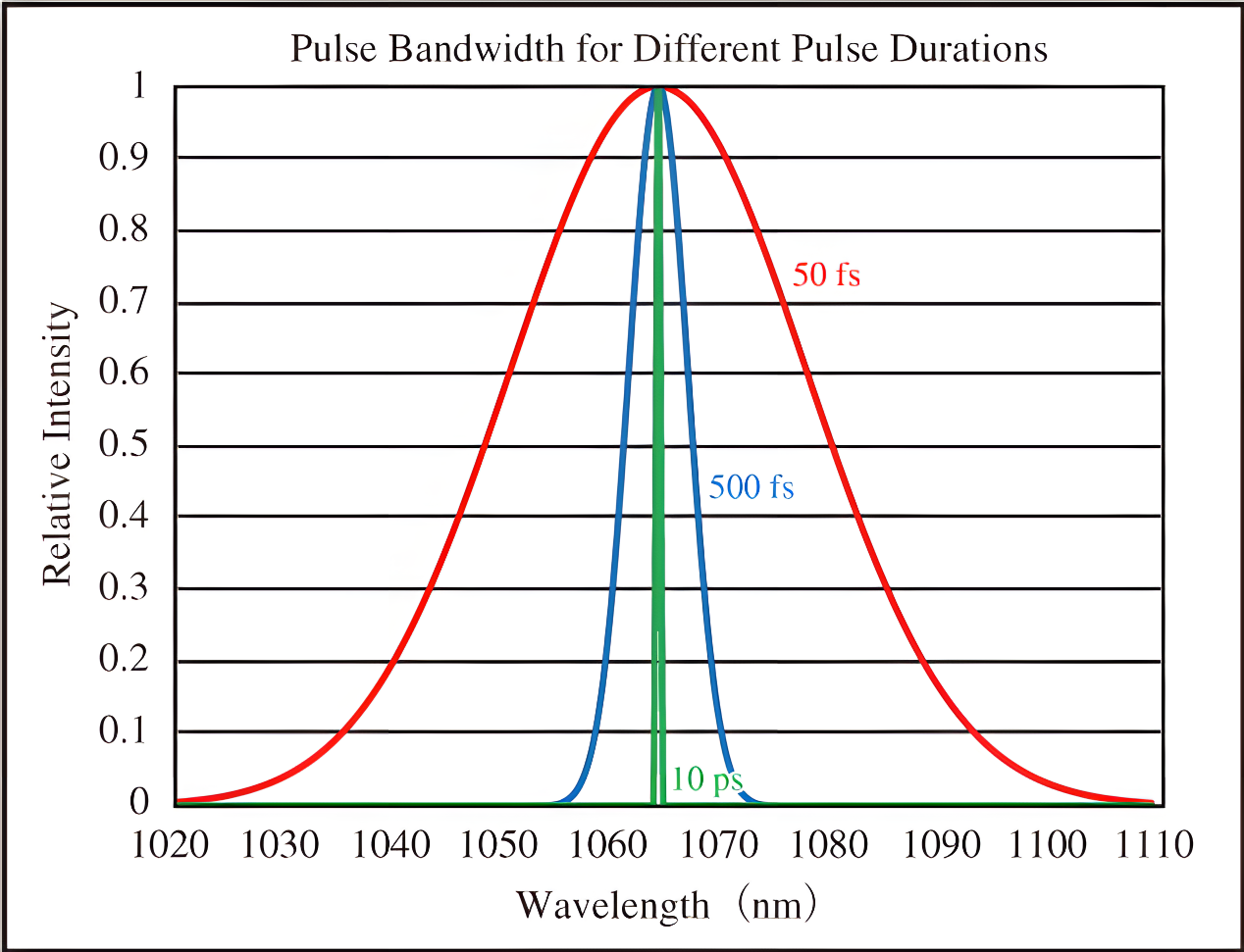图1:超短脉冲激光的脉冲持续时间越短,波长带宽就越宽