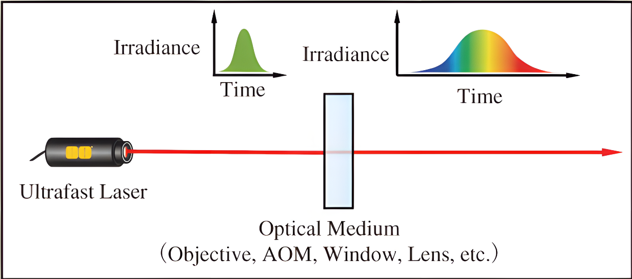 图5:飞秒超短脉冲通过不同光学介质后的时间展宽(脉冲持续时间的增加)