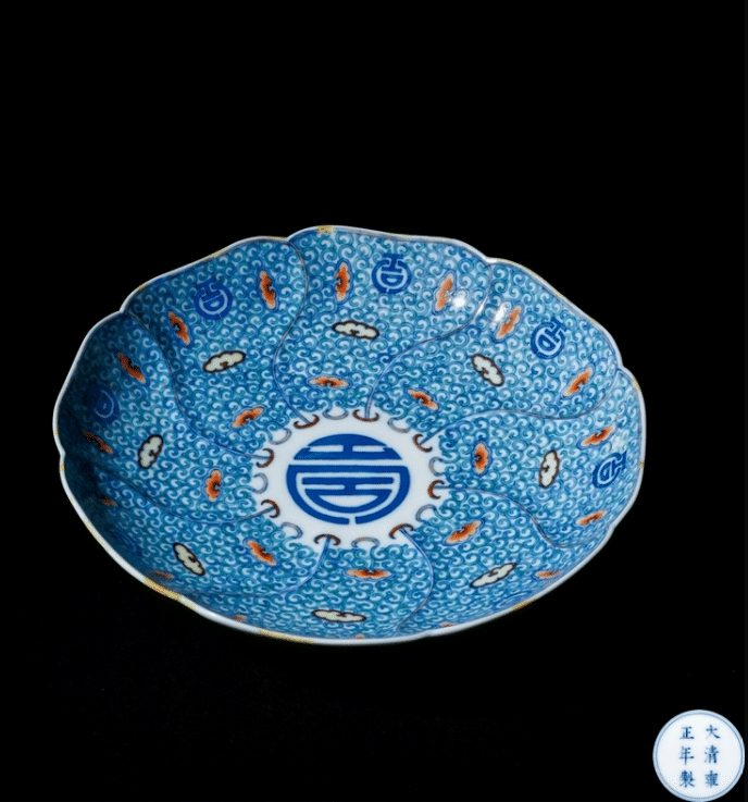 清雍正 斗彩缠枝灵芝团寿字葵瓣盘
