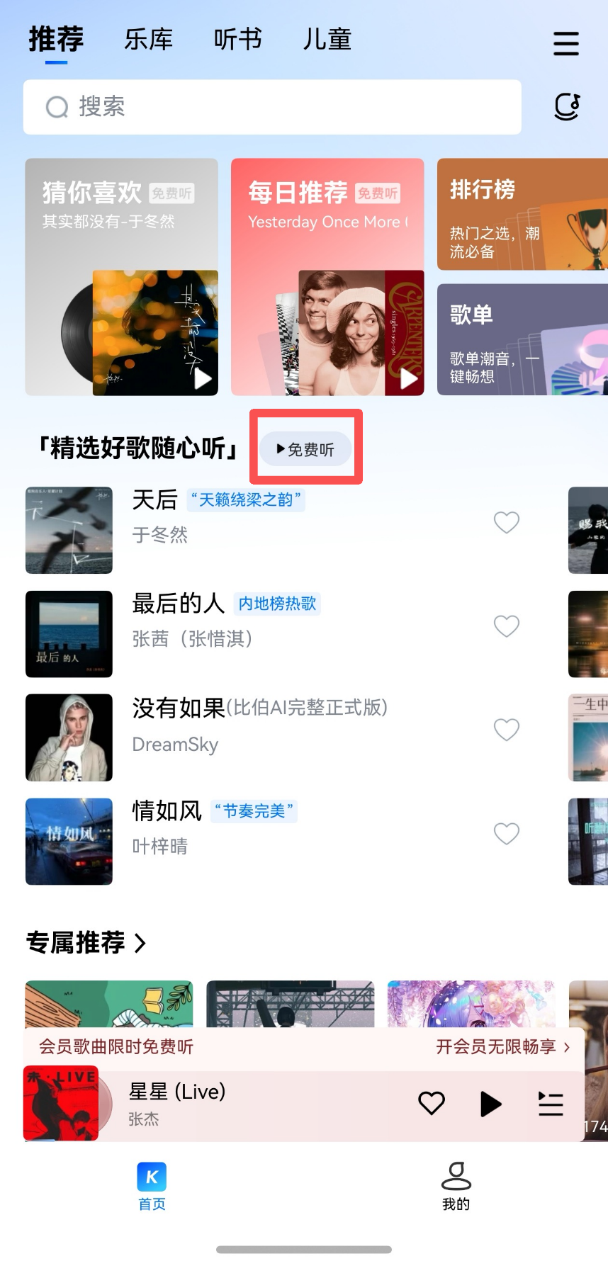 还有个超实用的功能——首页推荐歌曲全部免费畅听!看到感兴趣的歌可以随便点随便听,再也不用担心要付费错过喜欢的曲子了。