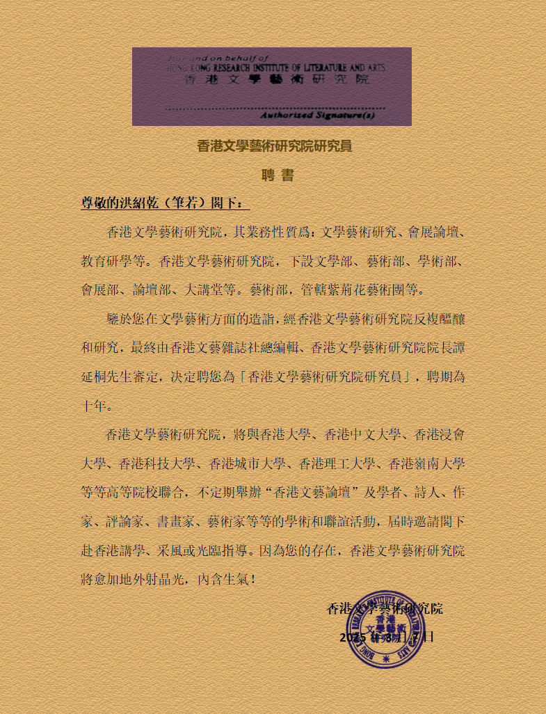 香港文学艺术研究院作为重要的文学艺术研究机构,长期致力于推动学术研讨、艺术创作与文化交流。未来,研究院将与香港大学、香港中文大学、香港浸会大学等多所顶尖高校联合举办“香港文艺论坛”及各类学术联谊活动。作为新聘研究员,洪绍乾将受邀赴港参与讲学、采风及学术指导工作,与两岸四地的学者、作家、艺术家展开深度对话,进一步促进当代诗歌与文艺理论的跨地域交流。