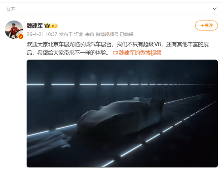 然而就在北京车展前,长城汽车董事长魏建军在社交媒体发布了北京车展的预热视频,在视频中魏建军不仅穿上了场地赛装备,更是公布了之前在长城产品序列中从未出现的新物种——超跑。