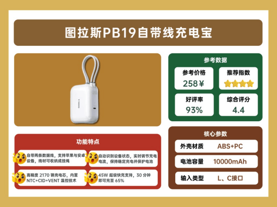 图拉斯 PB19 配备 10000mAh 电池,额定容量 6500mAh,自带两条可收纳线,一条兼容苹果和安卓,收纳时还能作为手提绳。充电线采用苹果同款尼龙编织工艺,耐磨性强。