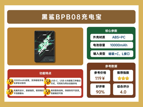 这款黑鲨充电宝外观个性,采用亮黑色 PC+ABS 材质,带有机能风图案,透着赛博朋克风格。它支持磁吸功能,内置强磁力阵列,能够稳稳吸附在手机背面,充电时无需担心脱落。10000mAh 容量足够日常外出使用,但不自带数据线,若手机不支持磁吸,需要自备线材。