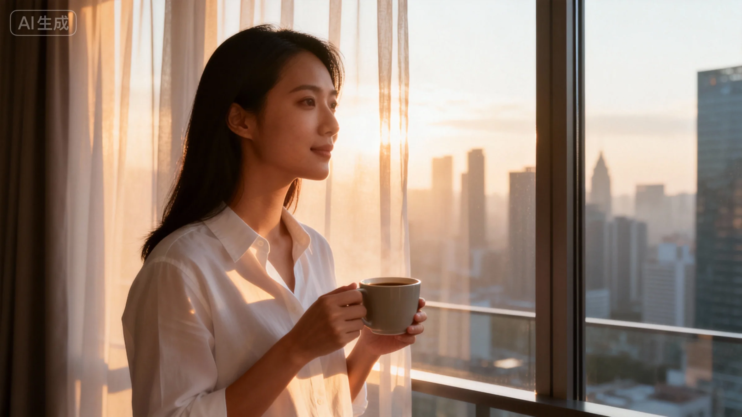场景1描述:"一位穿着白衬衫的年轻女性,站在落地窗前端着咖啡杯,清晨阳光透过窗帘洒进来,城市天际线作为背景,写实摄影风格,温暖色调"
