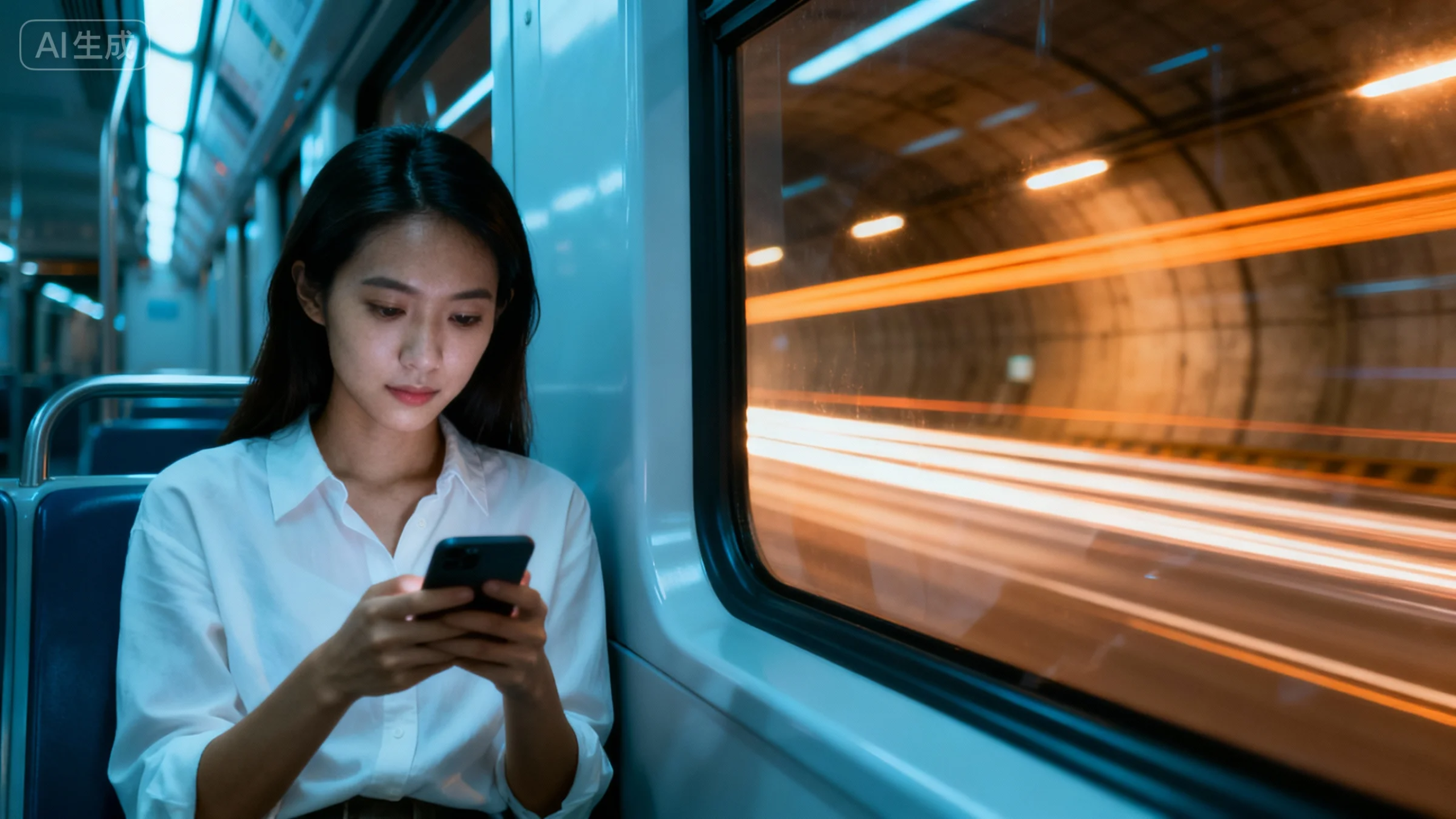 场景2描述:"同一位女性,在地铁车厢内低头看手机,车窗外是快速移动的隧道光线,表情专注,现代都市氛围"