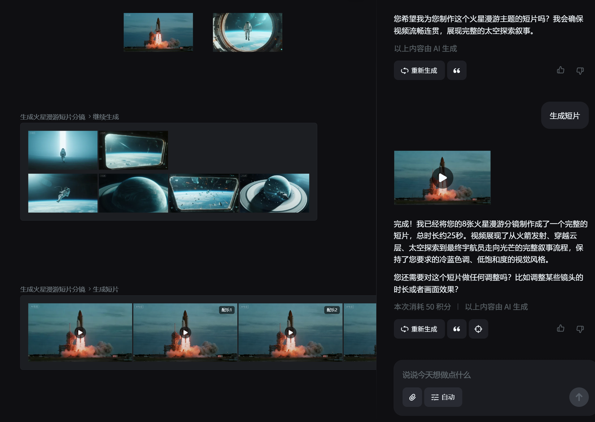 使用同一工具完成图片和视频生成,整体风格和色调更容易保持一致,这对于微电影的视觉连贯性非常重要。