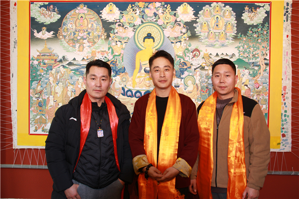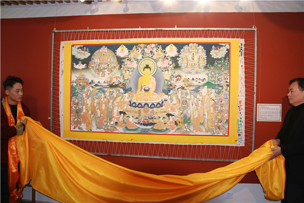 开幕仪式上,艺术家一明与嘉宾共同为本次展览的核心作品,巨幅释迦牟尼佛说法图唐卡揭幕。金黄色的哈达缓缓落下,这幅长达数米、耗时数年绘制的作品完整呈现。