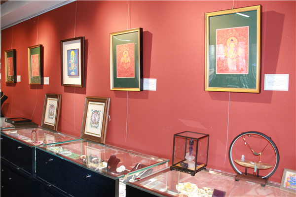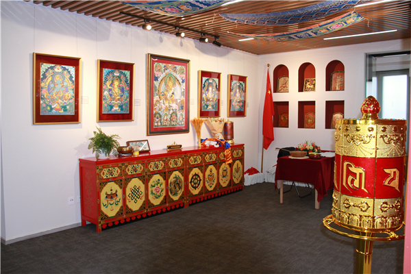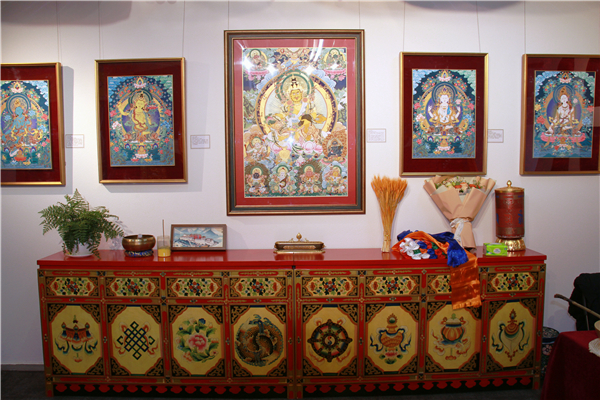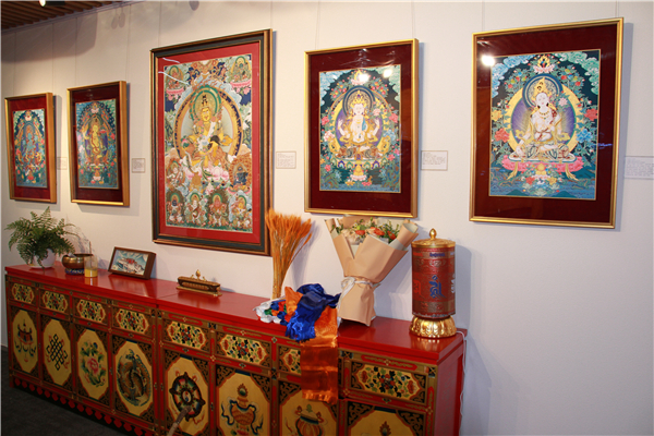 沉浸式藏地文化体验:展览现场还原了藏式陈设,以彩绘佛柜、经幡、佛像摆件营造出庄重而温暖的氛围,观众可在临摹互动区体验矿物颜料设色、描金等工序,近距离感受唐卡绘制的虔诚与精微。