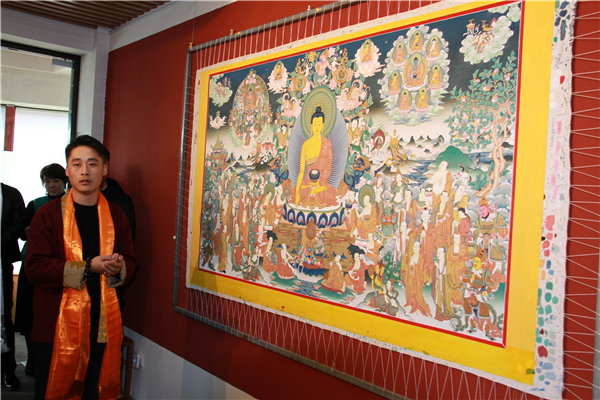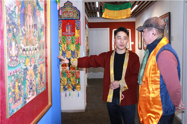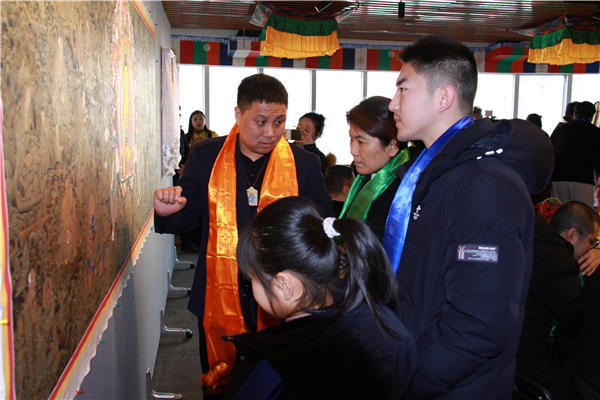 艺术家一明现场为观众导览,讲解作品细节与创作理念:结合巨幅唐卡的人物布局,阐释“以艺载道”的创作初心。分享天然矿物颜料的研磨、设色等传统技法,让观众理解唐卡绘制的虔诚与精微。强调唐卡不仅是艺术作品,更是藏文化的“图像史书”与修行载体。