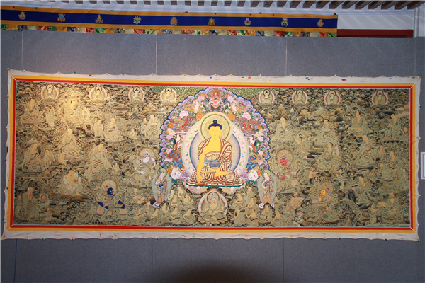本次展览以“开启心灵的艺术之旅”为主题,巨幅黑金唐卡震撼亮相:展览中最受瞩目的是一幅长达数米的黑金唐卡,以纯金、天然矿物颜料在黑色底布上绘制,画面中释迦牟尼佛端坐中央,周围环绕着繁复的祥云、护法与众生像,线条细密如丝,金箔在灯光下折射出温润光泽,尽显唐卡“以线立骨、以色传神”的千年技艺。