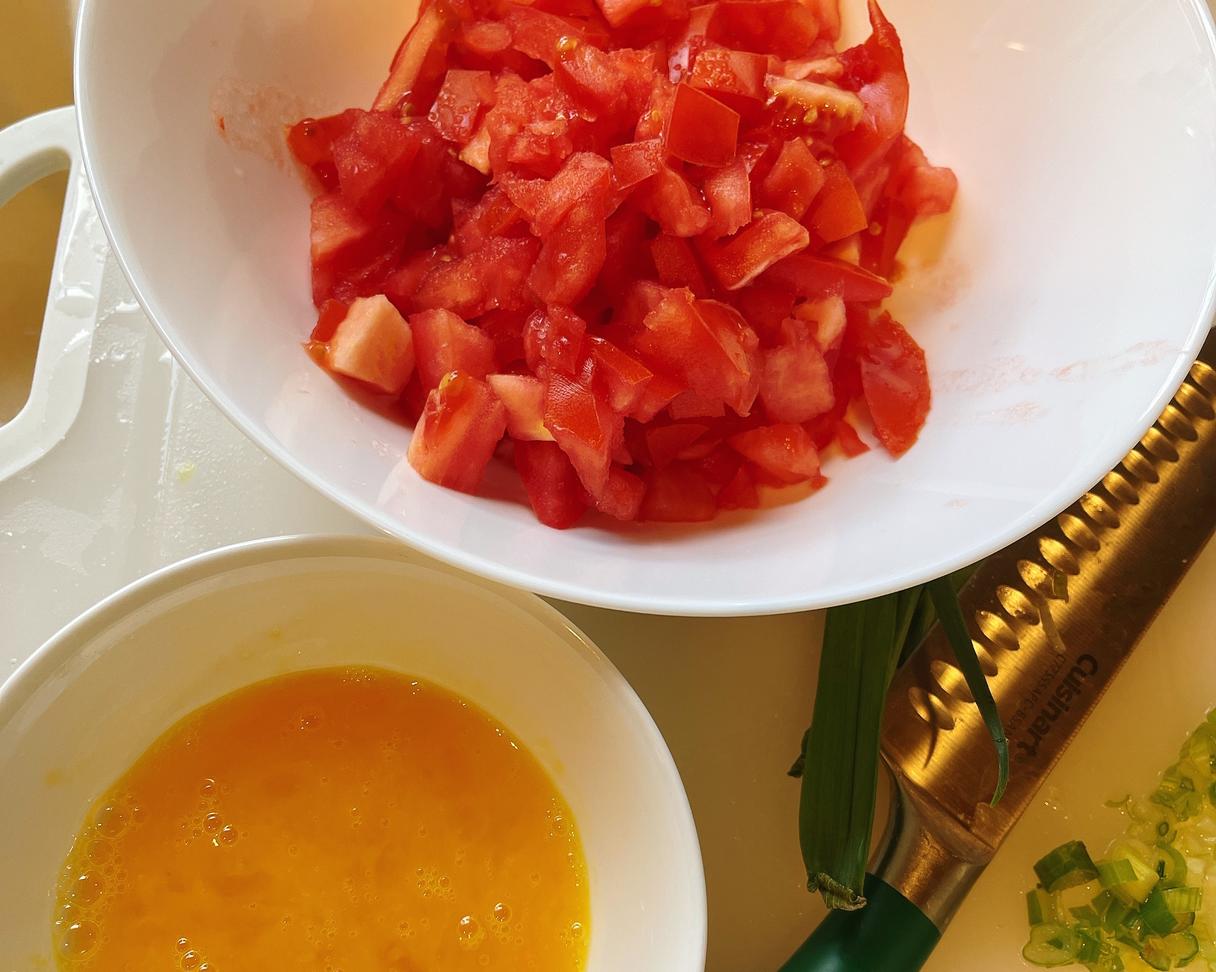 西红柿处理:西红柿洗净,顶部切十字花刀,用开水烫一下去皮,然后切成小块备用。