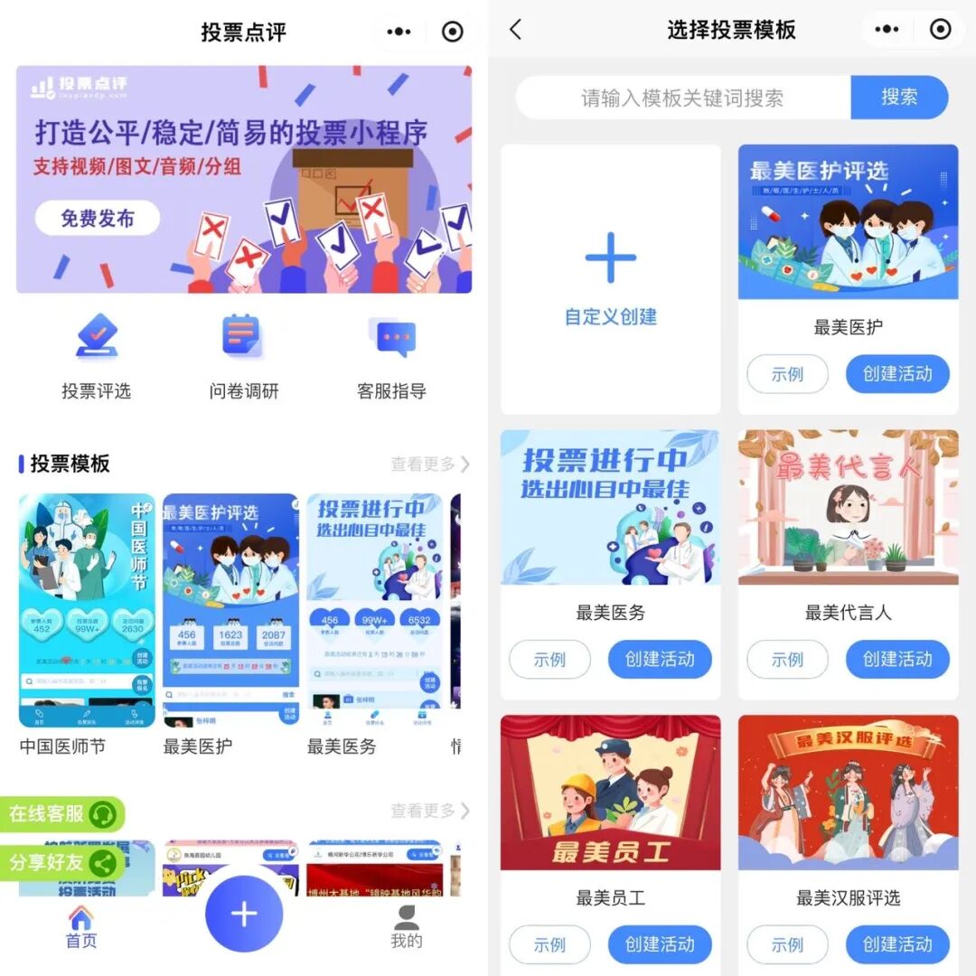 点击小程序首页的“投票评选”按钮,进入模版选择页面。该小程序提供海量模版,符合不同的风格和场景,满足各类投票需求。我们可以选择与“最美新生”相关的模版或自定义创建。