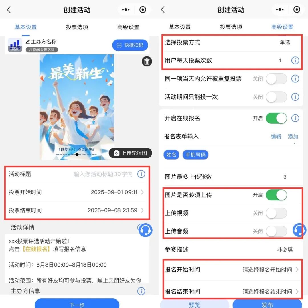活动名称:给投票活动取一个简洁明了又能准确传达活动主题的名字,比如“2025年度最美新生评选活动”,让参与者一眼就能明白投票的内容。