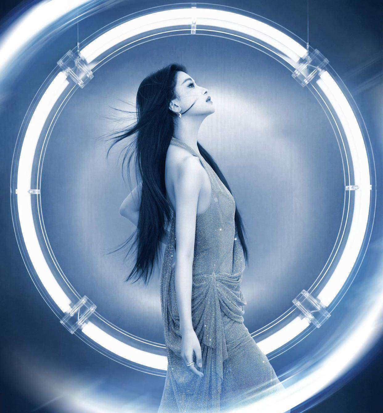 当天她穿的银色星光爆闪长裙,裙身布满了细碎的亮片与钻饰,光线打在她的裙摆上,闪烁出如同银河般的光辉。修身的剪裁完美贴合她的身形,勾勒出她曼妙的曲线,巧妙的高开叉设计更是大胆地露出了她那修长笔直的美腿。视觉上的比例被无限拉长,令她看起来更加高挑迷人。搭配利落的发型和精致的妆容,整体造型冷艳又大气,带着一种疏离感和高级感,仿佛是一个从画中走出来的高贵女子。