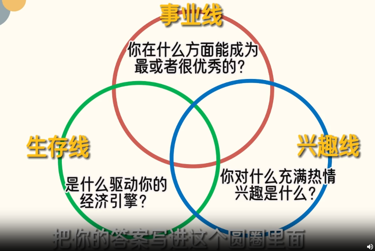 这三个问题分别对应着的其实是你的优势(事业线)、喜欢(兴趣线)、市场需求匹配(生存线),你要找出这三者的交汇重叠处。对普通人来说,如果分顺序,第一优先考虑生存线,市场需求匹配,哪些平台、哪些行业、哪些赛道还有机会;再考虑优势,你比别人更擅长做什么,先不管这个擅长是不是你所喜欢。