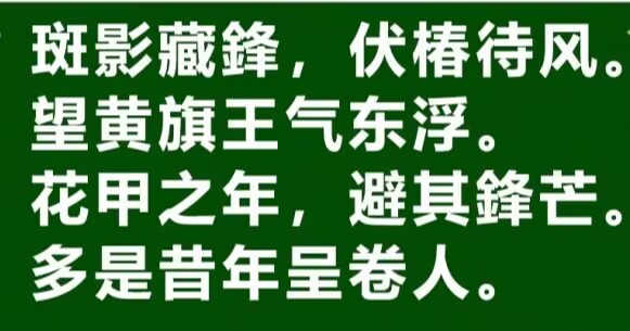 “斑影藏锋,伏椿待风”,以树为喻:树干斑驳,却将锋芒收进年轮;椿木深伏,只在等一阵风起。这是“藏”的智慧——花甲之年,已识得锋芒之累,故把锐气炼成底气。