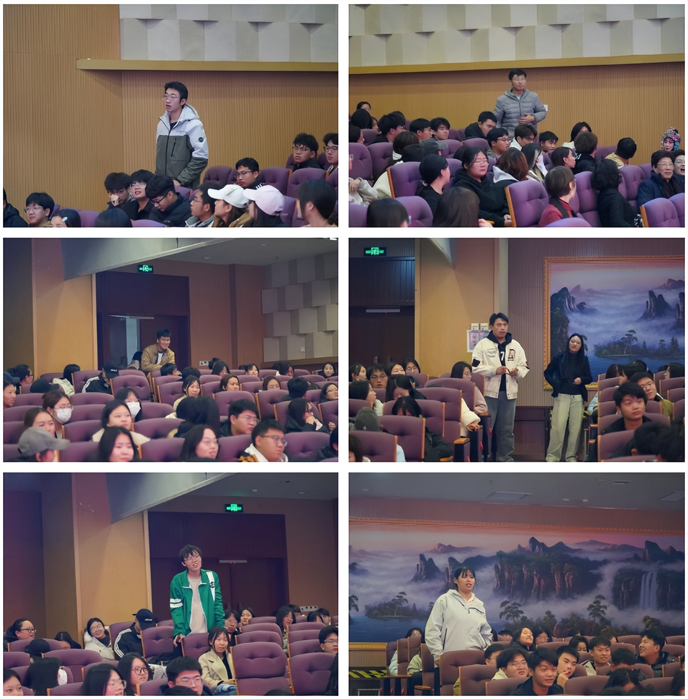 讲座尾声,陈平对京剧核心唱法进行系统梳理与精妙总结,随后以 “教学式演唱” 为引,现场清唱传统剧目《铡美案》与现代京剧《海港》的经典选段,字里行间皆是技巧示范,腔韵之中尽是艺术传承。他主动邀请同学们互动交流,将活动氛围推向高潮。互动环节,陈平围绕讲座知识点抛砖引玉,师生们踊跃应答,思维的碰撞与文化的共鸣在现场弥漫;刘萍则走上舞台,手把手传授京剧 “开门” 动作的手法与姿势,指尖的辗转、身段的开合,让学生们亲身感受戏曲程式艺术的严谨之美与灵动之韵。