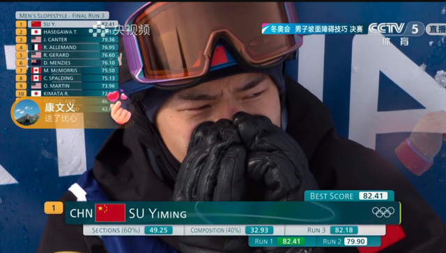 决赛场上,苏翊鸣第五个出场。第一滑,他就像是雪上飞人一样,动作干净利落,转体、抓板、落地,一气呵成。82.41分!就这一轮,他直接锁定了胜局 。虽然后面两轮有的选手失误,有的选手拼命追,但谁也没能撼动他的位置。