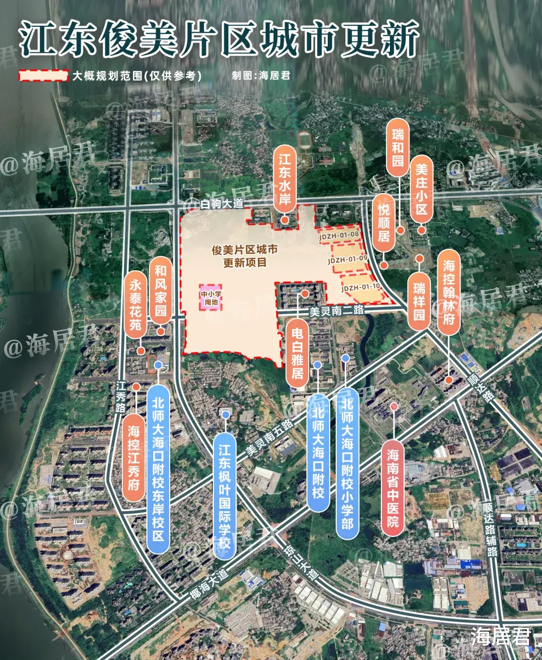 俊美城市更新规划范围东至海南省第一中级人民法院/顺达路、北师大海口附属学校,西至琼山大道,南至美灵南二路以南部分区域,北至白驹大道附近。