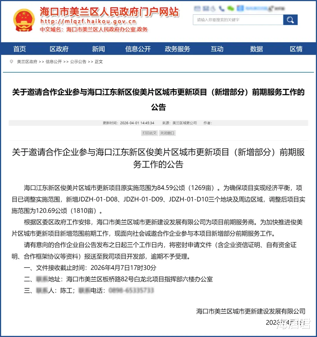 日前,海口市美兰区城市更新建设发展有限公司发出公告,邀请企业参与俊美片区城市更新(新增地块)的前期服务工作,意味着该城市更新正在实质推进。