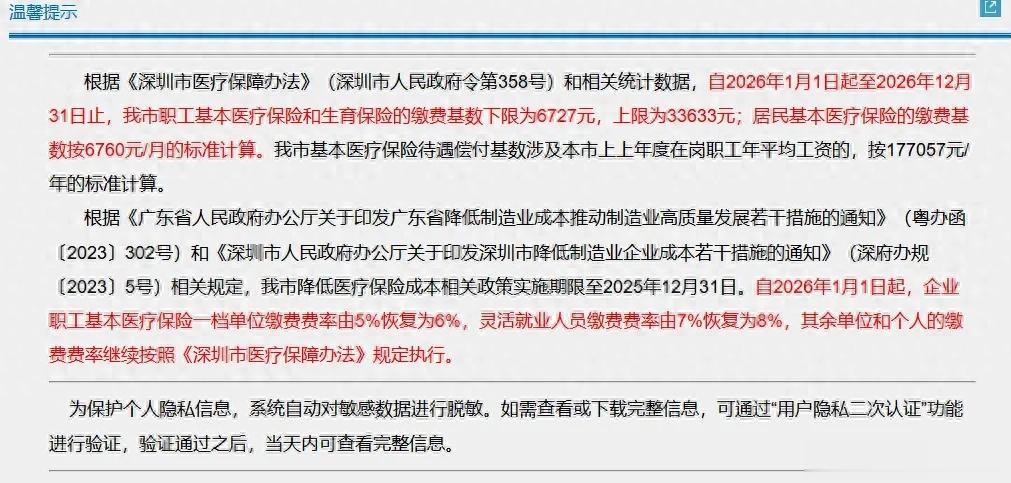 虽然2026年医保的最低缴费基数降了,但并不是所有人的缴费标准都能降,因为一档医保的缴费费率恢复了;2024-2025年期间,深圳市为了降低企业和灵活就业人员的医保缴费成本,把一档医保原总体8%的费率阶段性降低为7%,2026年1月起恢复到8%。