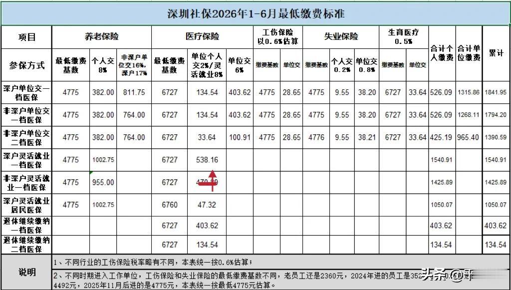 好了,接下来我们就看一下深圳社保2026年的最低缴费标准,由于养老保险的最低缴费标准每年7月还会调整,笔者做的表格就适用于2026年1-6月。