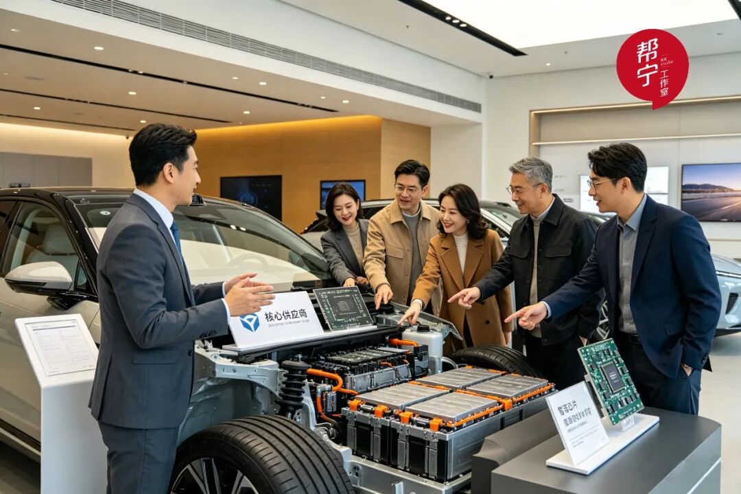 帮宁工作室近期走进多家4S店与商超展厅,听到销售顾客开口第一句是“这是某品牌新车”,紧接着便是“我们用的是XX电池、XX智驾、XX芯片”。