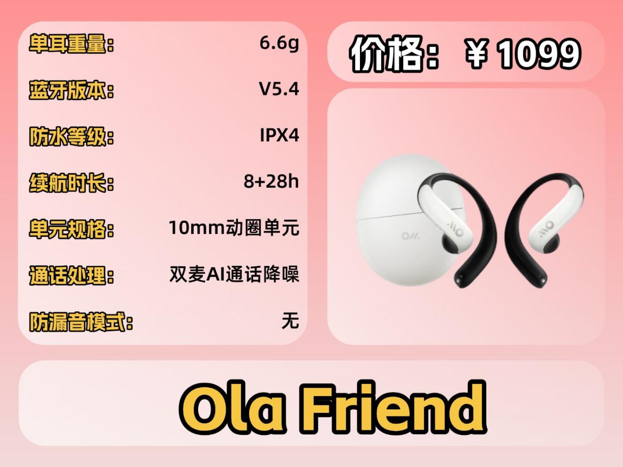 耳机搭载的蓝牙 V5.4 芯片为其提供了稳定且高效的连接,保障了日常使用的流畅性;耳机8+20 小时的续航能力足以轻松应对日常需求;它配备了四麦高清降噪通话功能,即便在不同场景下也能保持人声清晰,显著提升了通话时的使用体验。总的来说Ola Friend 这款耳机的整体使用体验相当出色。