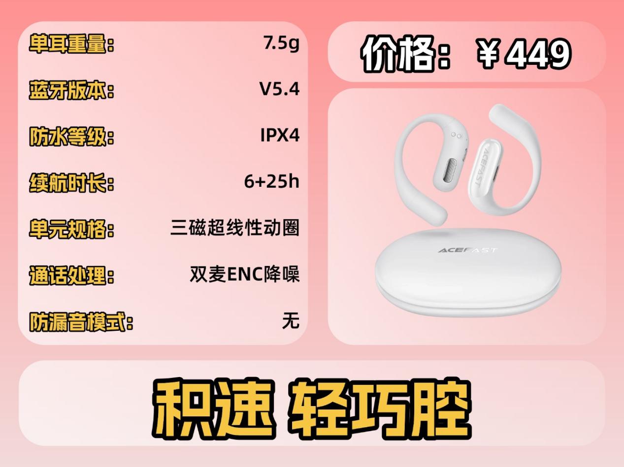 耳机的耳挂采用天鹅颈结构设计,可轻松适配眼镜,让戴眼镜的朋友也能舒适佩戴;同时单耳仅 9.5 克的轻量化设计,佩戴时可以减少了耳部的压迫感;耳机还支持IPX4 防水,平时出汗或者遇到小雨,都不用怕会影响它使用。再加上黄金角度拐点设计,即便是长时间佩戴,也不容易出现酸痛问题,全方位兼顾舒适与实用性。