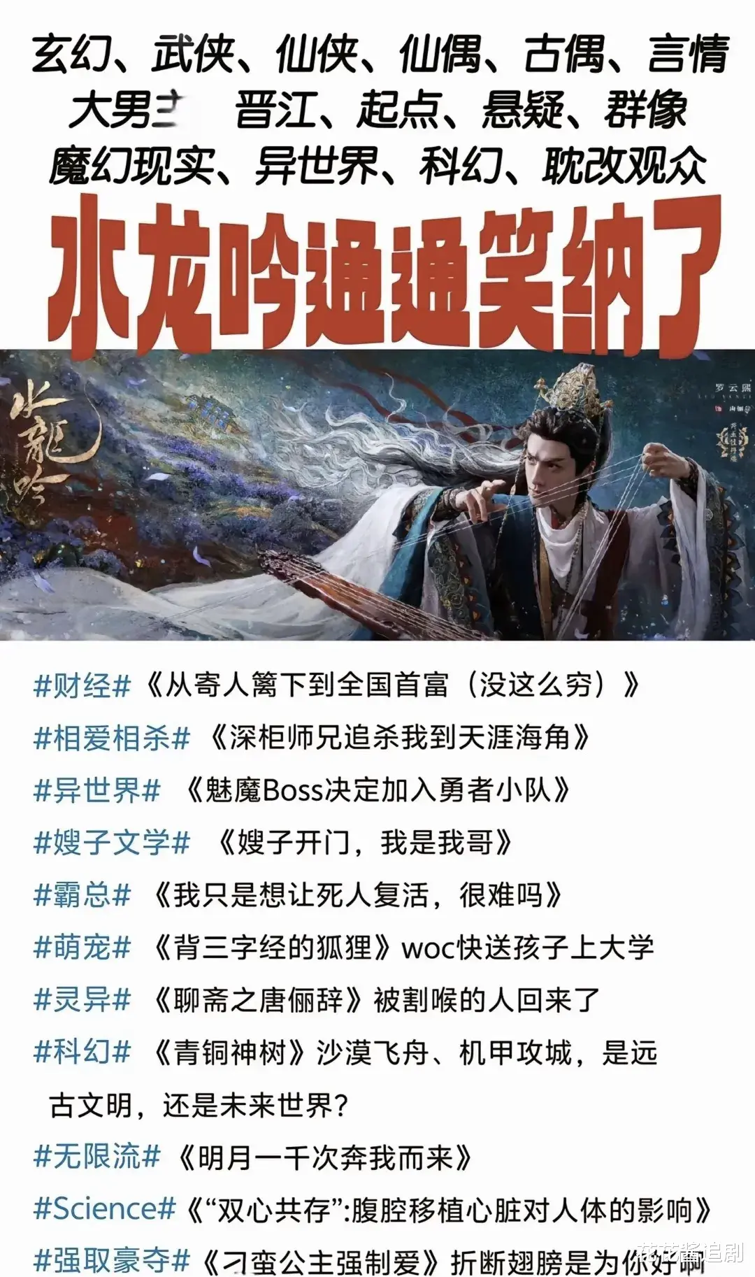 《水龙吟》原著小说实际上名为《千劫眉》,作者是藤萍,是一部玄侠小说,融合了武侠、悬疑和奇幻元素,说白了大概故事简介就是:一个外星狐狸掉在地球上,被四个帅哥收养,单纯的狐狸爱上了他们,后来饲养员入魔,狐狸为了救他取了他的心脏自己养着,多年忍受双心之痛,取心脏的时候被误会了,被以往的的师兄弟们当成了怪物,他开始闯副本对抗家族势力复活白月光,一路遇到了对他强取豪夺的美女帅哥,但是他心里只有白月光……